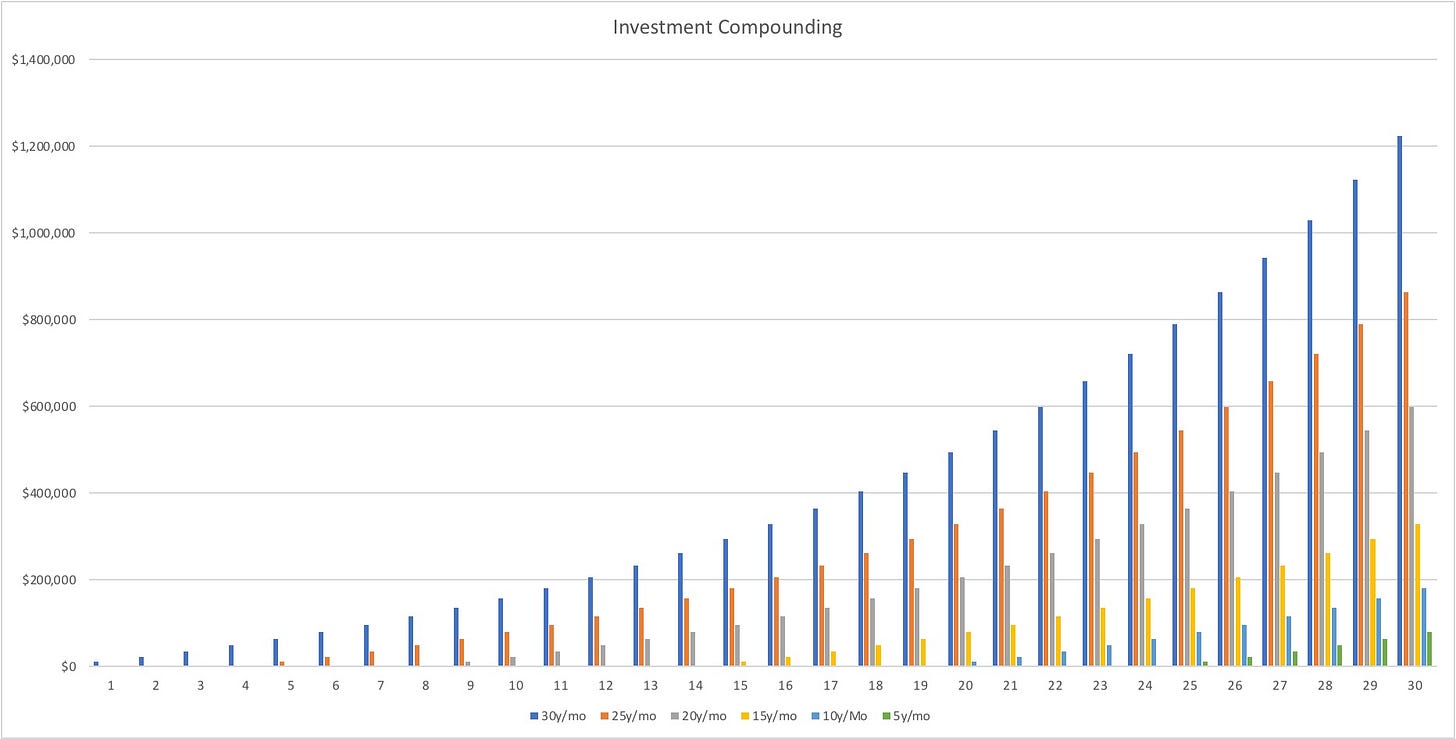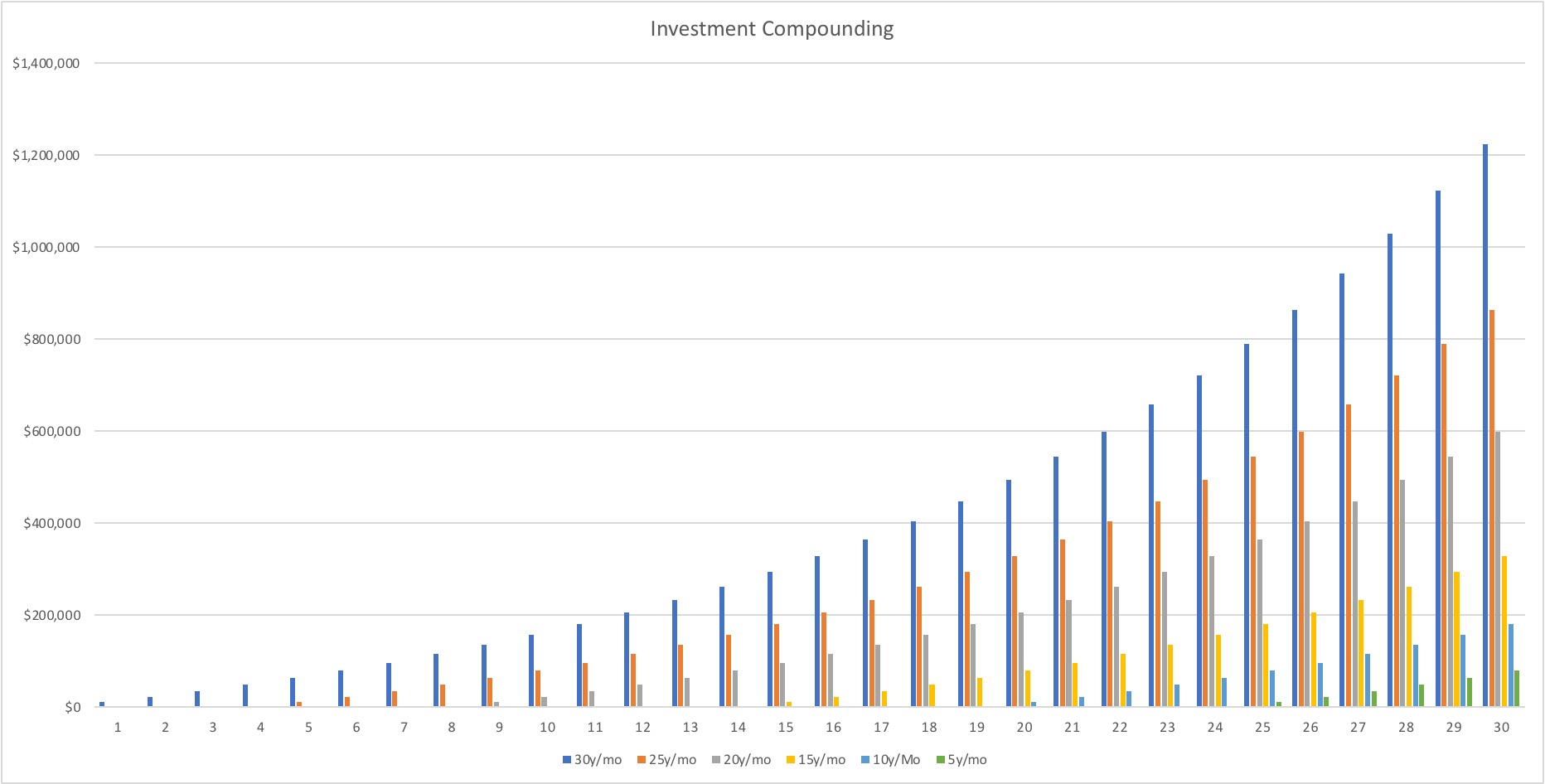 Choose to invest $10,000 a year for 30 years ( viable horizon for many in their 20-30’s). What if you succumb to instant gratification and delay investing by 5,10, 15, 20, 25 years?